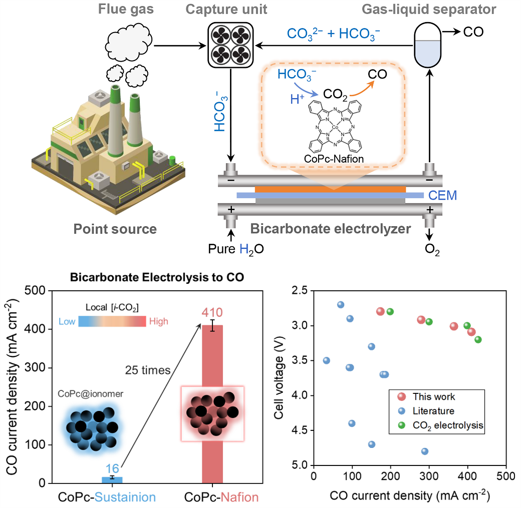 Researchers improved the bicarbonate electrolysis performance by manipulating reaction microenvironments by introducing ionomers into cobalt phthalocyanine (CoPc) electrodes. In a cation exchange membrane-based zero-gap electrolyzer, the CoPc electrode modified with a Nafion ionomer exhibits a high CO Faradaic efficiency of 93% at an applied current density of 300 mA cm−2 and a CO partial current density of 410 mA cm−2 at a low cell voltage of 3.09 V.