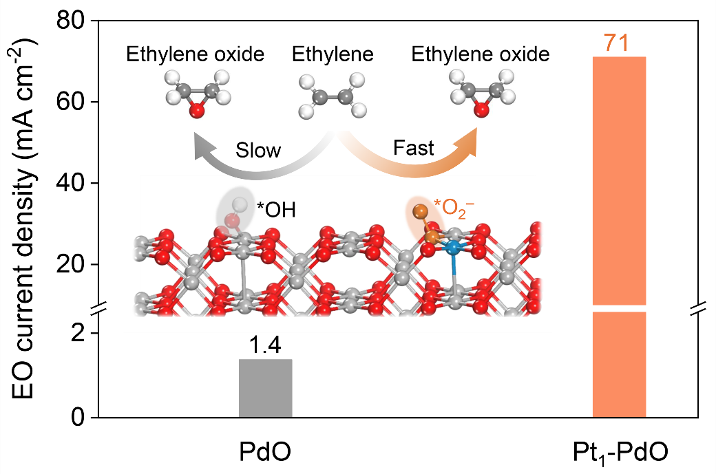 The team designed a catalyst consisting of Pt single atoms supported on palladium oxide (PdO), which facilitates the formation of superoxo species as reactive oxygen species (ROS) and accelerates the selective oxidation of ethylene. This catalyst enables efficient EO production in a zero-gap anion exchange membrane-based membrane electrode assembly (MEA) electrolyzer, achieving a Faradaic efficiency of 74% and a partial current density of 71 mA cm–2.