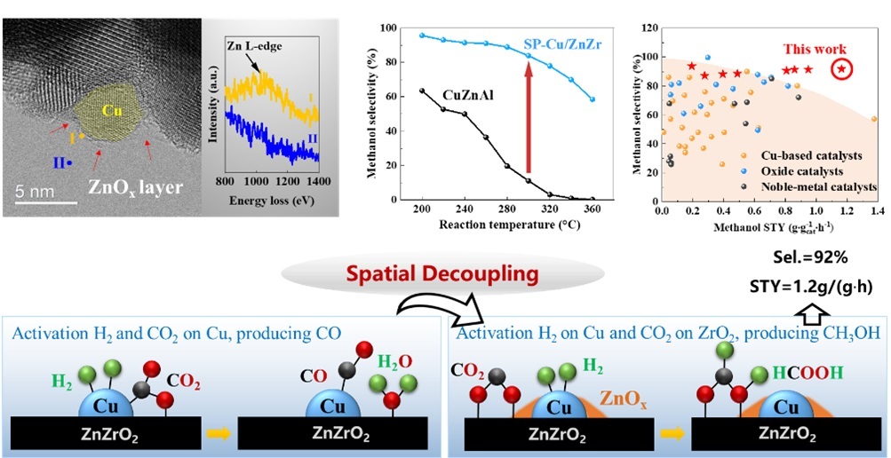 The structure and performance of the SP-Cu/ZnZr catalyst, along with the schematic of the spatial decoupling strategy (Image by YU Jiafeng)